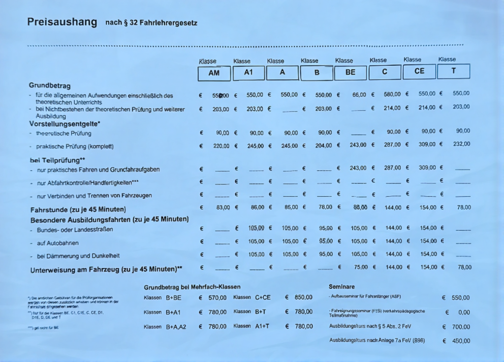 Zusätzlich zu den Stundenpreisen fallen behördliche Gebühren sowie Prüfungsgebühren der jeweiligen Führerscheinklasse an.